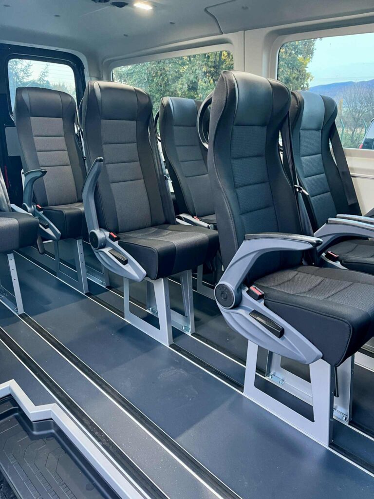 MAN Tge – Mikrobus a priestranná komfortná 9 miestna dodávka s automatickou prevodovkou, nezávislým kúrením a obrovským batožinovým priestorom. Poctivé auto koncernu VW group je ideálne na pohodlnú prepravu 8 pasažierov + vodič. Predné sedadlo vedľa vodiča je samostatné, vyhrievané, pozdĺžne a výškovo nastaviteľné s možnosťou zmeny sklonu operadla pre pohodlnejšie sedenie. V zadnej klimatizovanej časti pre cestujúcich je 7 sedadiel s lakťovými opierkami s možnosťou úpravy sklonu operadiel.